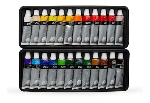 Colores que contiene el estuche: Blanco - Crema - Amarillo Limon - Amarillo Mediano - Amarillo Oscuro - Naranja - Rojo Brillante - Rojo Escarlata - Rojo Carmesi - Rosa - Magenta - Violeta - Azul Claro - Azul UIltramar - Azul Oscuro - Verde Mediano - Verde Hoja - Verde Claro - Verde Oscuro - Ocre - Marrón Claro - Tierra Sombra Natural - Marrón - Negro.